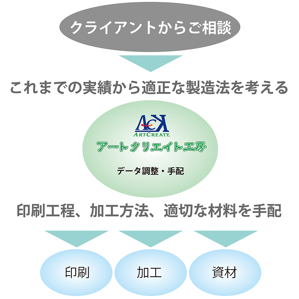 印刷といっても様々で、どうすればベストな製造ができるのか分からないといったご相談をいただきます。 アートクリエイト工房では、 使用頻度、使用場所、使用期間などもご相談した上、どういった製造がベストなのかを考えて製造を行います。 その時にはしっかりとデータ調整をさせていただきます。