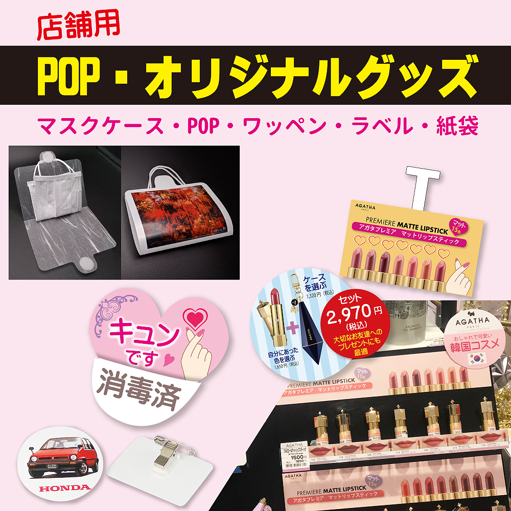 デザインデータ支給でお好みのオリジナルグッズが作成できます。データ作成方法、入稿方法はご相談ください。 ※マスクケースは既成のデザイン柄に品名、店名などを入れるのは無料です。