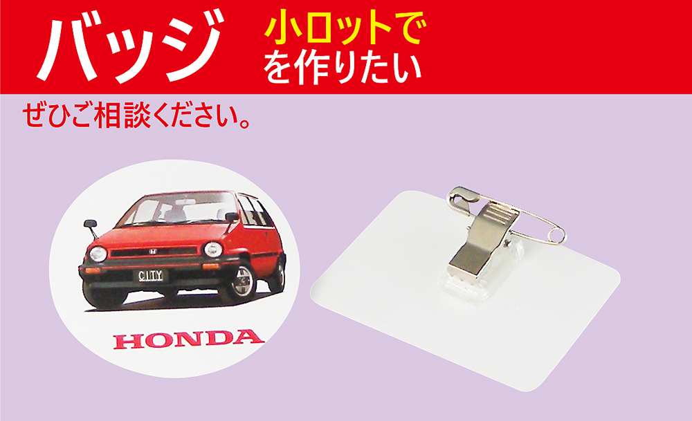 アートクリエイト工房がご提案するプラスチックバッジは変色、経年変化の少ない0.18mm厚のPET素材です。基本形の丸や角丸だけでなく、お好きな形のバッジが作成可能です。図案に合わせた複雑な形状のデザインも対応可能ですので個性的なオリジナルグッズの作成などにおすすめです。 ※角が鋭利なデザインでは怪我の原因になるため、角が丸いデザインをお勧めします。プラスチック素材のバッジは、様々な場面でオールマイティーにご使用いただけるアイテムです。 イベントでの配布、オリジナルグッズの作成のような個人向けに。ノベルティー販促品や企業PR、サークルや部活用のバッジにもご活用いただけます。
