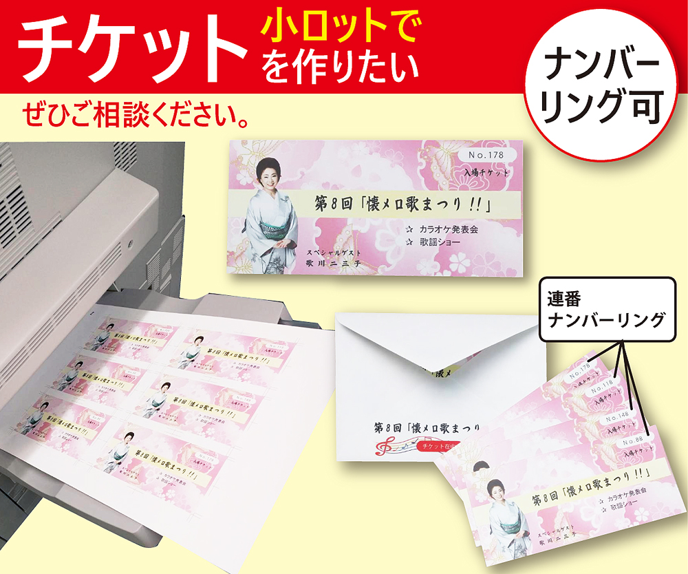 チケットの販売を委託を数カ所にお願いする場合に、販売数・返品数の 管理を簡単にするため、ナンバー入チケットが便利。