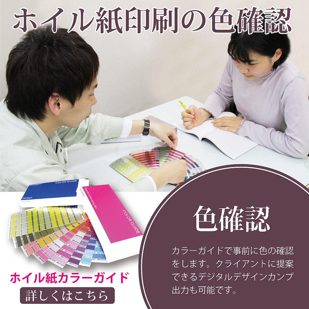 ホイル紙印刷の場合簡単にプリンターでは表現できません。そのためクライアント様にデザインを見せにくいといった問題があります。 アートクリエイト工房では、事前にオリジナルのカラーガイドなどで打ち合わせながらデジタルカンプを出力可能です。 しかも、このオリジナルカラーガイドはホイル紙に普通に印刷したものと擬似エンボスにしたものが同色で比較できるようになっていて便利です。